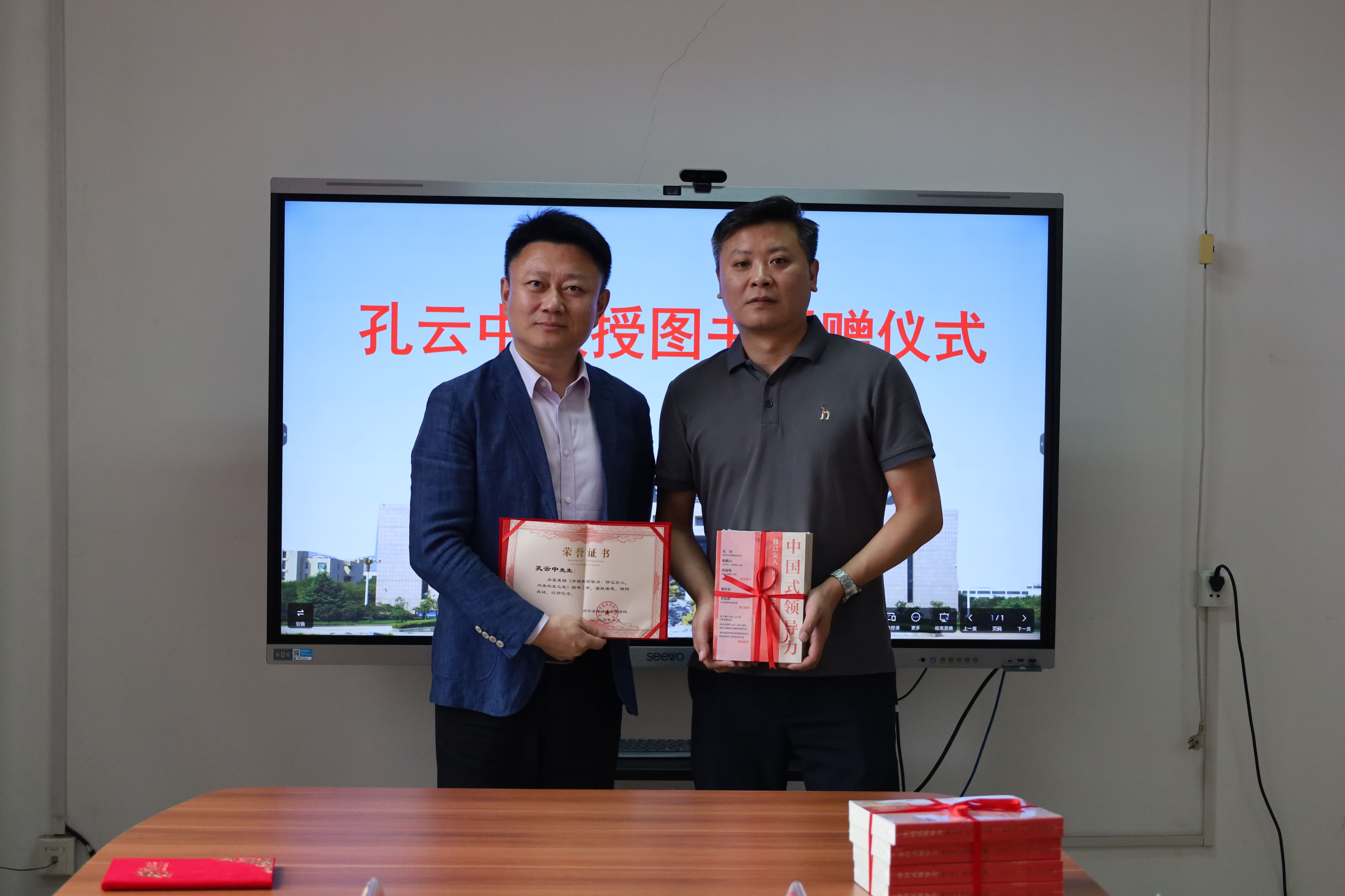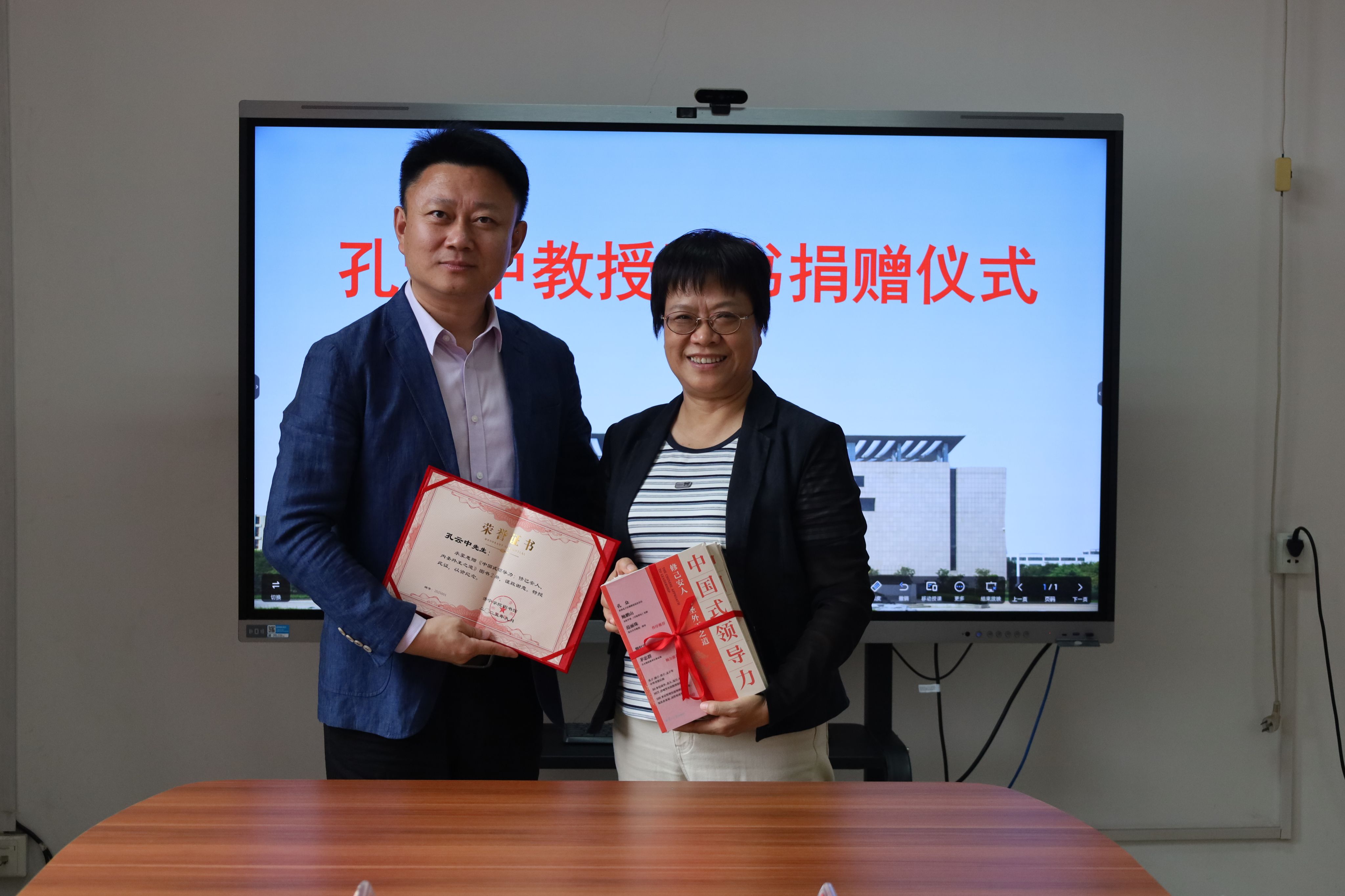 9月18日下午,复旦大学社会发展研究中心研究员、复旦大学中国式领导力研究基金执行主任、上海大学经济学院兼职教授孔云中向我校图书馆、经济管理学院捐赠其新作《中国式领导力:修己安人、内圣外王之道》。图书馆馆长刘欣、经济管理学院副院长董腾及相关人员参加捐赠仪式。