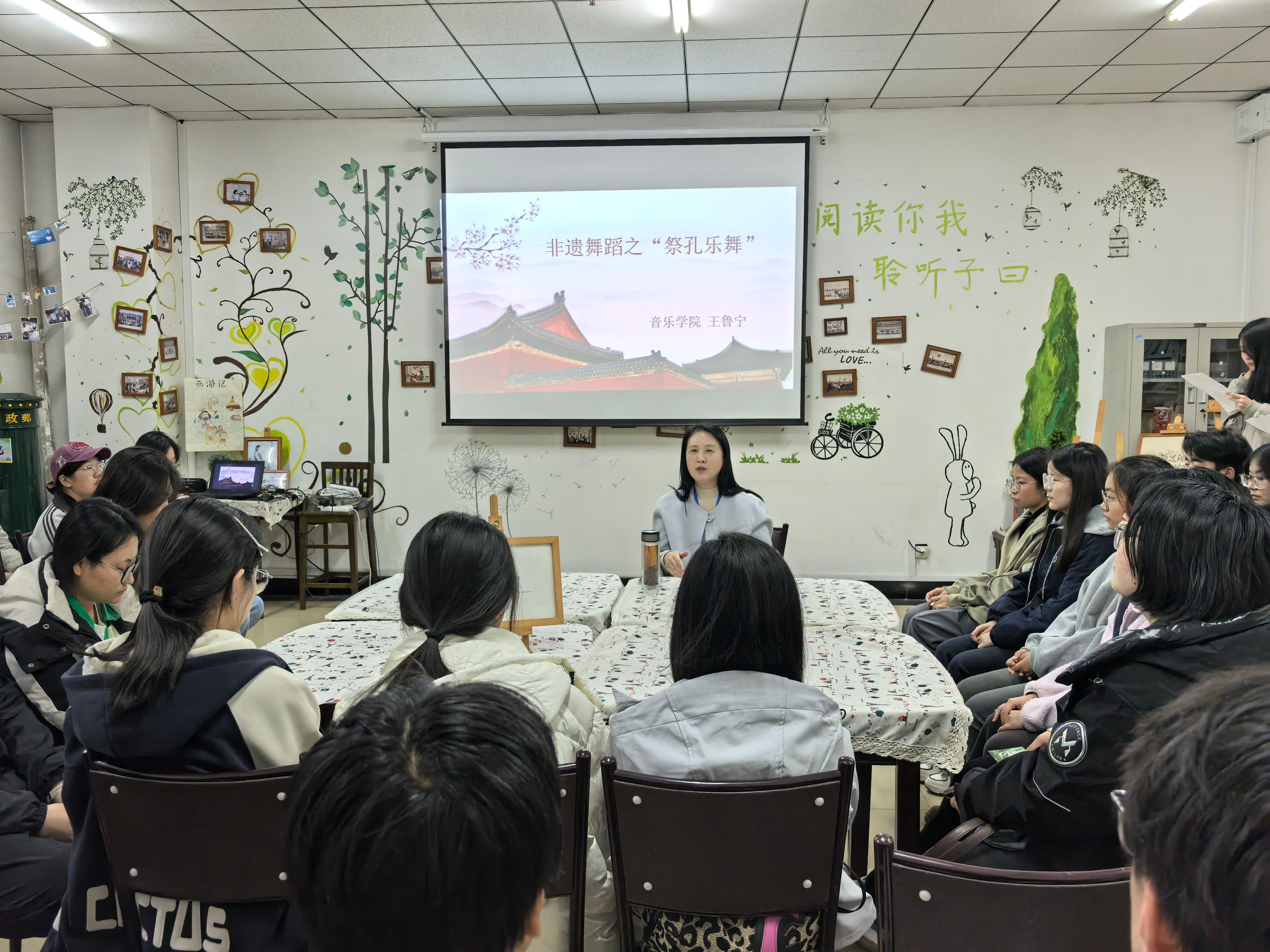 活动伊始,深耕舞蹈艺术领域多年的王鲁宁老师,以曲阜祭孔大典和孔子文化节为引,向我们介绍了传统文化之美,解析了八佾舞、民间秧歌和宫廷芭蕾等不同类型舞蹈的艺术特质与分类逻辑;同时结合藏族服饰“一长一短袖”的劳作巧思、蒙古族靴履适配马背生活和草原的设计智慧,阐释“美源于生活实用”的内核,并提及“得体的穿着亦是服饰之美”,拓展了美育的感知维度。
