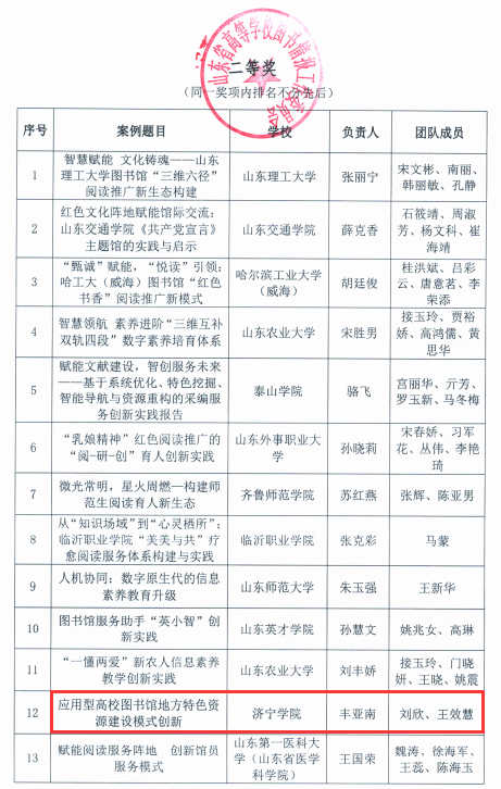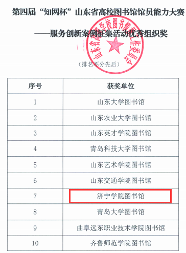 近日,由山东省高校图工委等单位联合主办的第四届“知网杯”山东省高校图书馆馆员能力大赛服务创新案例征集活动圆满结束。我校图书馆荣获二等奖一项,优秀奖两项,并获优秀组织奖。