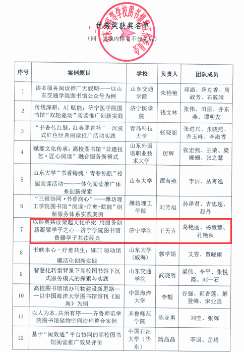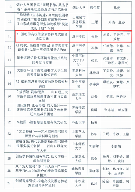 本次大赛涵盖高校图书馆阅读推广、学科服务、资源建设、技术实践、信息素养教学、管理规划六大主题,吸引了省内50多所高校、300余名馆员参加。经过专家组评审,共评选出一等奖9项、二等奖17项、三等奖20项、优秀奖27项,以及优秀组织奖10项。我校图书馆丰亚南、刘欣、王效慧团队的《应用型高校图书馆地方特色资源建设模式创新》荣获二等奖,宋敏、刘欣、王效慧、王天卉团队的《AI驱动的高校信息素养探究式翻转课堂实践》,王天卉、葛艳丽、杨慧慧、孔艳秋团队的《以经典共读架起文化桥梁,用服务创新凝聚学子之心:济宁学院图书馆鲁疆学子共读经典服务创新案例》获得优秀奖,济宁学院图书馆同时荣获“优秀组织奖”。