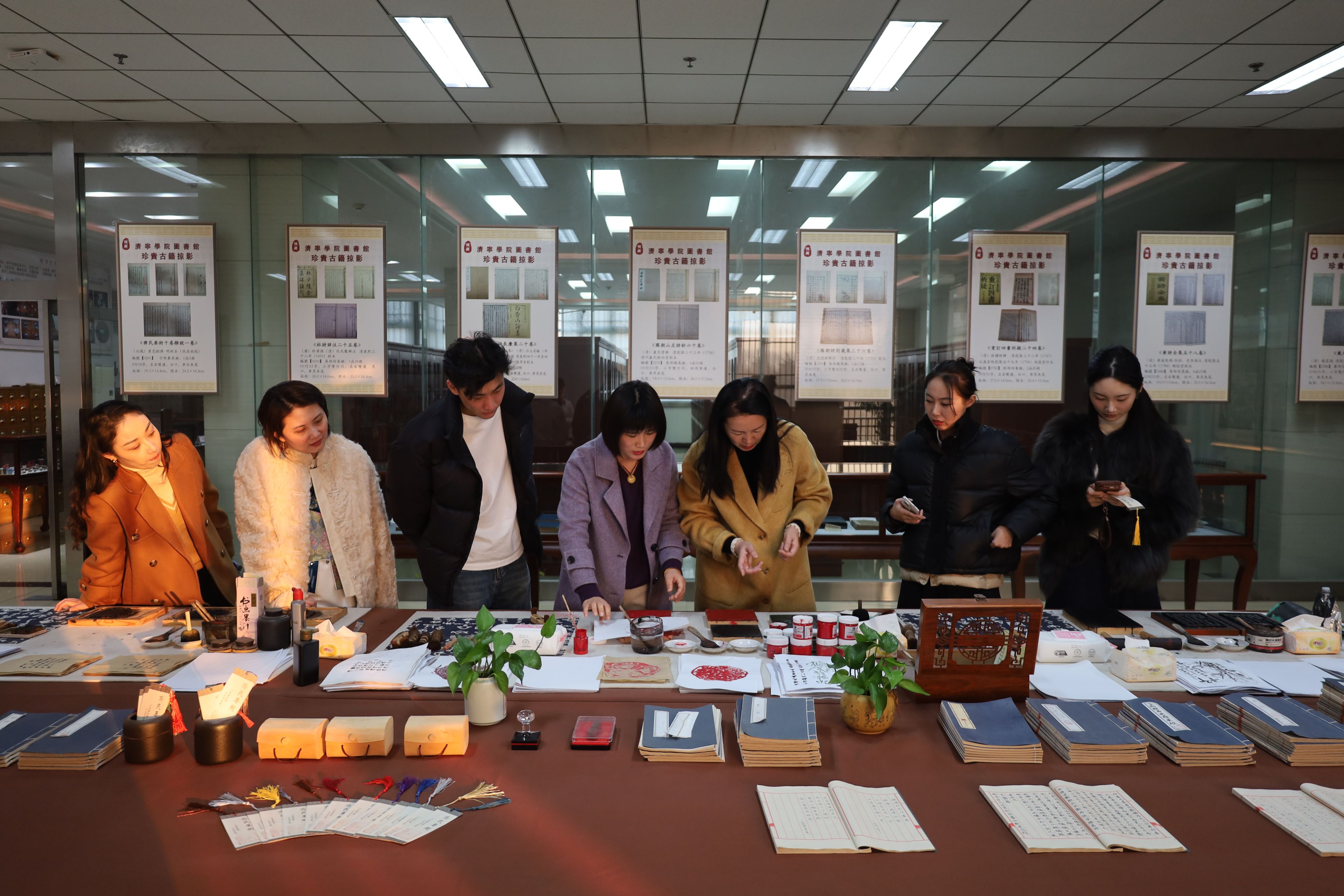 在艺术书库,老师们现场借阅了数本专业书籍,表示回去后要让学生们多来图书馆借书读书,利用好如此丰富的资源;在学校的老照片墙前,老师们驻足凝神,有的老师惊喜地发现了自己青年教师时期的影像,感慨自己的职业生涯伴随着学校从专科、到本科,到现在再攀高峰的发展历程;在古籍阅览室,老师们参观了我校的古籍珍本,沉浸式体验了活字印刷、雕版印刷技术,现场预约了再来图书馆体验线装书制作、文创作品研讨交流的时间;在孔子学堂和子悦空间,老师们对图书馆的文化育人活动兴趣盎然,表示未来可以在国学诵读、传统文化展演体验等方面开展深入合作。