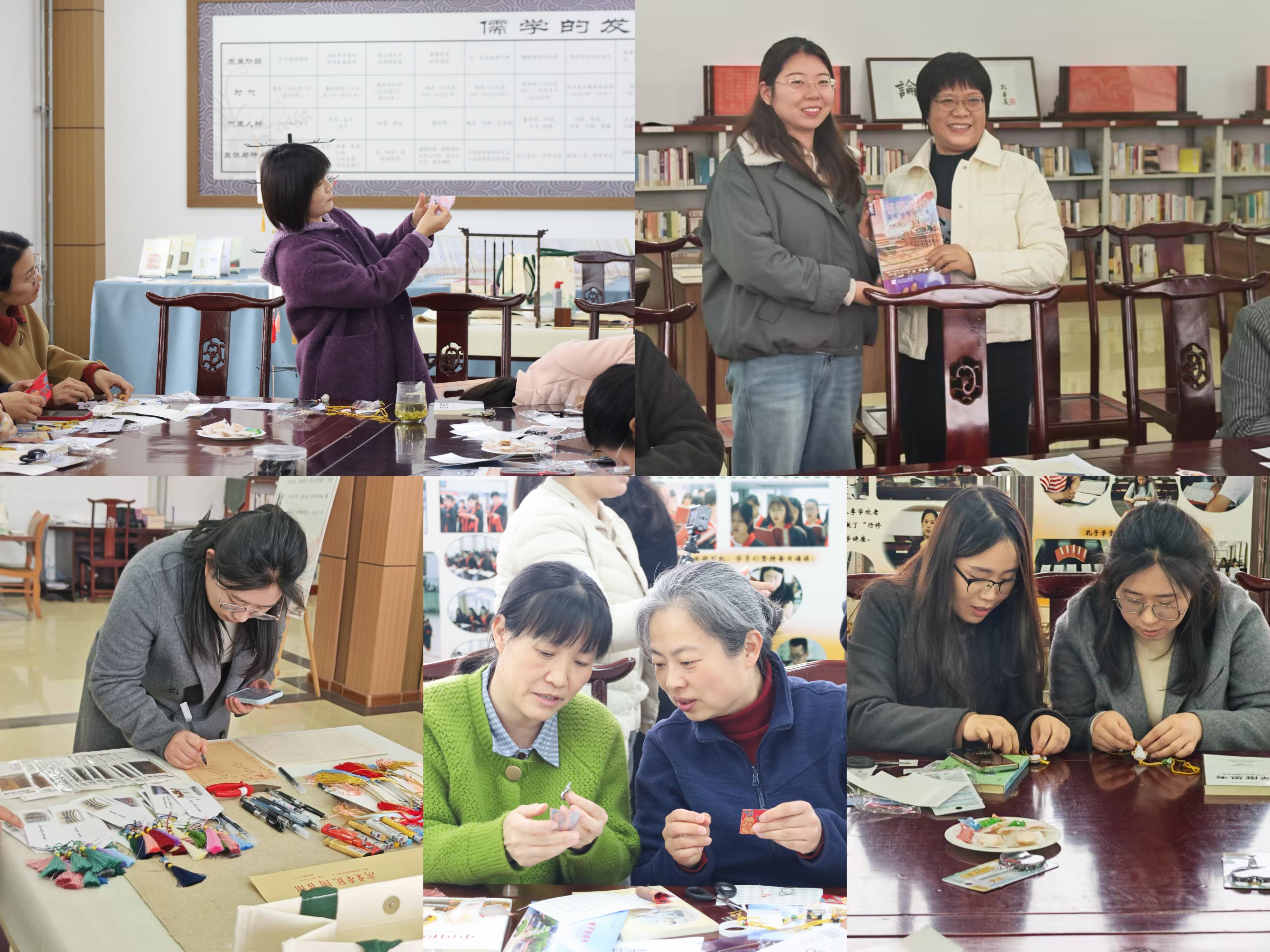 非遗手作体验环节将活动推向高潮。图书馆宋敏老师现场示范指导,带领大家体验宋锦葫芦吊坠制作。宋锦作为我国传统丝织工艺的瑰宝,质地典雅、纹样含蓄,承载着千年江南文人的审美意趣,恰与女性温润内敛、雅致温婉的气质相得益彰;而葫芦谐音 “福禄”,寓意吉祥安康。老师们凝神专注,穿针引线、精细修剪、巧手打结,在一针一线的实操中沉浸式感受非遗技艺的独特魅力。当一枚枚精巧别致的宋锦葫芦吊坠在指尖诞生,大家互相欣赏、交流创作心得,现场欢声笑语不断,温馨美好的瞬间在合影留念中永久定格。
